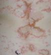 Fig. 1.—Vesículas, pústulas y costras agrupadas, formando placas anulares con curación central en la espalda.