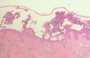 El estudio histológico de las lesiones cutáneas mostró una pústula subcórnea con abundantes neutrófilos en su interior y algunos queratinocitos acantolíticos en el suelo de la misma (fig. 2). Mediante inmunofluorescencia directa (IFD) se demostró depósito de inmunoglobulina G (IgG) en la superficie de los queratinocitos. La inmunofluorescencia indirecta (IFI) fue negativa.