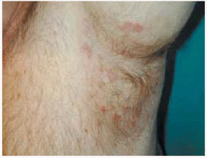 Fig. 1.--Lesiones vesiculopustulosas y eritematosas en zona axilar.
