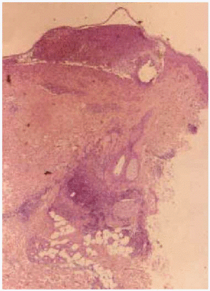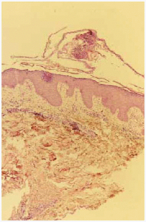 Fig. 3.--Ligera acantosis de la epidermis, con pústula subcórnea e infiltrado inflamatorio mixto en dermis superficial.