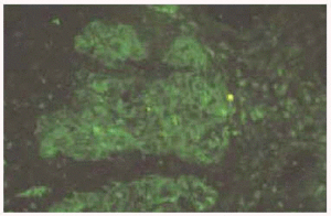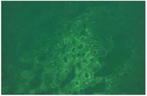 Se realizó biopsia de una de las lesiones, que mostró la existencia de una ligera acantosis de la epidermis y la presencia de pústulas subcórneas, junto con un moderado infiltrado inflamatorio de tipo mixto en la dermis superior (fig. 3). En la inmunofluorescencia directa se observaba depósito de IgA y C3 entre las células epidémicas subcórneas (fig. 4). La inmunofluorescencia indirecta fue negativa.