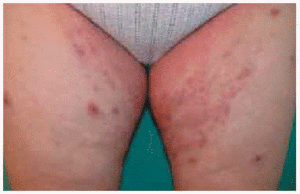 Fig. 5.--Lesiones vesiculopustulosas en cara interna de muslos.