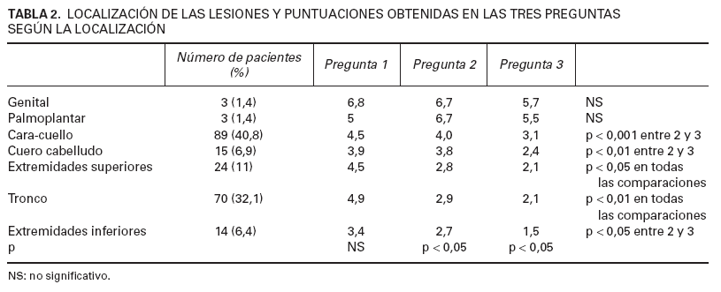 Al clasificar nuestra población por sexo, no encontramos diferencias significativas en ninguno de los aspectos evaluados. En la tabla 3 se reflejan las respuestas a las tres preguntas. Cuando a los pacientes se les clasifica por la localización de la lesión intervenida encontramos diferencias significativas en la edad (los pacientes con intervenciones en la cara y cuello eran mayores que los de tronco o extremidades superiores), técnica utilizada (mayor frecuencia de electro-coagulaciones en tronco y cara y cuello que en las áreas palmoplantares y genitales) y las respuestas a las preguntas 2 y 3 (los pacientes de áreas palmoplantares y genitales puntuaron significativamente más que los de extremidades inferiores, tronco y extremidades superiores). La expectativa de dolor (pregunta 1) fue similar para todas las localizaciones (tabla 2).