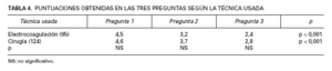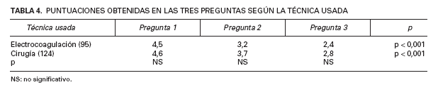 Al clasificar a los pacientes según la técnica utilizada, la única diferencia significativa fue que los pacientes sometidos a cirugía fueron significativamente mayores que los sometidos a electrocoagulación (54 frente a 45 años). No hubo diferencias en las respuestas (tabla 4). Al clasificar a los pacientes según sus antecedentes anestésicos no encontramos diferencias en ningún parámetro en estos grupos. Finalmente, al comparar el grupo que usó EMLA® con el que no lo usó (tabla 5), se encontró que los pacientes que usaron EMLA® puntuaron más bajo en las preguntas 2 y 3(p < 0,05 y p < 0,001, respectivamente). En todas estas situaciones (tablas 3-5), las diferencias entre las preguntas 1, 2 y 3 mantuvieron su nivel de significación estadística.