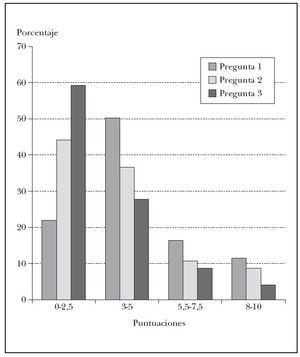 Fig. 1.—Distribución de las puntuaciones obtenidas en las tres preguntas. Se reunieron las puntuaciones en 4 grupos (de 0 a 2,5; de 3 a 5; de 5,5 a 7,5, y de 8 a 10). Se representa el porcentaje de pacientes que dio cada grupo de puntuación.
