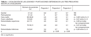 TABLA 2. LOCALIZACIÓN DE LAS LESIONES Y PUNTUACIONES OBTENIDAS EN LAS TRES PREGUNTAS SEGÚN LA LOCALIZACIÓN