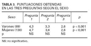 TABLA 3. PUNTUACIONES OBTENIDAS EN LAS TRES PREGUNTAS SEGÚN EL SEXO