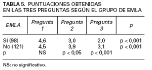 TABLA 5. PUNTUACIONES OBTENIDAS EN LAS TRES PREGUNTAS SEGÚN EL GRUPO DE EMLA