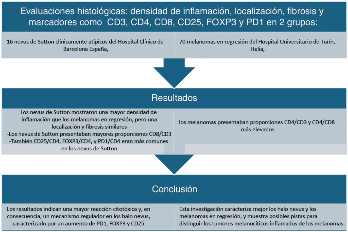 MetodologíaSe evaluó una cohorte de 16 nevus de Sutton clínicamente atípicos del Hospital Clínic de Barcelona, España, y 70 melanomas con regresión del Hospital Universitario de Turín, Italia. Los evaluadores analizaron la densidad de la inflamación, su localización, la fibrosis y los marcadores CD3, CD4, CD8, CD25, FOXP3 y PD1.