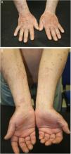 A 59-year-old man with type 2 diabetes mellitus who had experienced myocardial infarction 2 years earlier was seen for asymptomatic, generalized, somewhat photodistributed skin lesions that had appeared 1 year earlier and had not responded to topical corticosteroids. The patient was a nonsmoker and was taking daily fenofibrate, aspirin, acenocoumarol, metformin, pantoprazole, folic acid, and bisoprolol. He ruled out any connection between the dermatosis and his work, as the lesions persisted after he left his job as a plasterer.