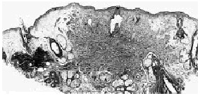 FIG. 2.--A pequeño aumento se observa una proliferación de fascículos de fibras musculares lisas que ocupan todo el espesor de la dermis.