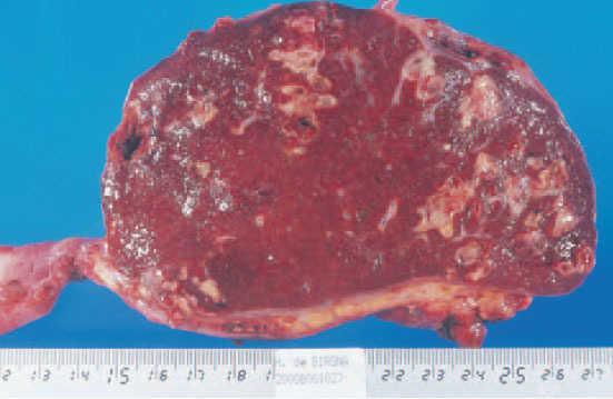 Fig. 3.—Pieza de esplenectomía con múltiples nódulos amarillentos que corresponden a abscesos esplénicos.