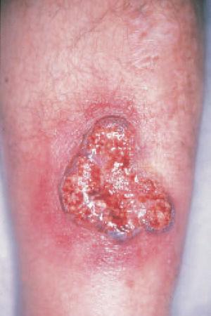 Fig. 1.—Lesión pretibial ulcerada de pioderma gangrenoso con cicatrices antiguas de otros brotes.