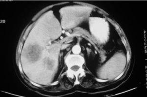 Fig. 2.—TC abdominal con lesiones redondeadas hipodensas en el hígado compatibles con abscesos.