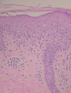 Se trata de un varón sano de 3 años, sin antecedentes personales ni familiares de interés, que fue atendido en nuestra consulta por la aparición de lesiones cutáneas en el abdomen desde hacía 3 meses. La erupción cutánea era asintomática, cursaba en brotes y dejaba una hipopigmentación lenticular residual en las zonas de regresión. El cuadro no se modificaba tras el tratamiento con corticoides tópicos de potencia moderada y alta, pero mejoraba levemente durante el verano en las zonas fotoexpuestas. En la exploración física se apreciaban pápulas descamativas eritematoparduzcas de 3 a 5 mm de diámetro en la zona abdominal inferior y ambas ingles. La descamación de las lesiones consistía en una única escama de aspecto micáceo, la cual era fácilmente desprendible con el rascado (figs. 1 y 2). El resto de la exploración clínica fue normal. En el estudio histológico se observaba una epidermis con acantosis irregular y extensas áreas de paraqueratosis confluente. En la dermis superficial existía un leve infiltrado linfocitario perivascular con afectación focal de la interfase, exocitosis y aislados queratinocitos necróticos (fig. 3). En la actualidad, el paciente tiene 9 años de edad y sigue presentando brotes recurrentes y autolimitados de lesiones cutáneas similares a las descritas que se localizan siempre en la zona abdominal inferior. Una segunda biopsia realizada en el transcurso del proceso demostró hallazgos histológicos similares a los descritos más arriba.