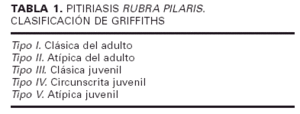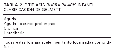 Es una enfermedad de gran polimorfismo clínico4. Ello hizo que Griffiths en 19801 la clasificara en cinco tipos diferenciables entre sí, basándose en el aspecto clínico, en la epidemiología y en la evolución (tabla 1). Sin embargo, pese a la reconocida utilidad de esta clasificación, algunos casos son difícilmente encuadrables en ella debido al amplio espectro de formas en que puede presentarse5, 6. Gelmetti et al cuestionaron el pronóstico en el grupo de edad pediátrica, proponiendo en 1986 una clasificación5, 7 basada en la duración de la enfermedad (tabla 2). Como en la mayoría de las enfermedades de etiología desconocida, en la PRP se han empleado múltiples terapéuticas3,4,7. La evaluación de la eficacia de las mismas es difícil debido al curso impredecible de la enfermedad y al carácter, en ocasiones, autoinvolutivo de la misma1,3.