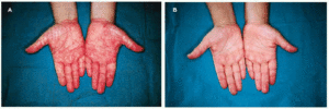 Fig. 1.--A: queratodermia palmar rosada antes del tratamiento. B: tras 2 meses con calcipotriol.