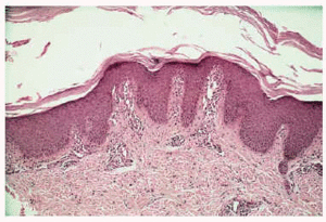 El diagnóstico de PRP se basa en la correlación clínico-histológica. Los hallazgos histológicos son típicos, pero no patognomónicos, variando según el estadio del proceso9. En la epidermis se aprecia acantosis irregular con hiperqueratosis ortoqueratósica, más marcada en los orificios foliculares donde forma tapones córneos. Es característica la presencia de focos de paraqueratosis en torno al orificio folicular, con ocasional espongiosis y degeneración vacuolar de la capa basal, y a diferencia de la psoriasis la granulosa está conservada o aumentada, no existiendo microabscesos de Munro. En la dermis se observa un infiltrado perivascular mononuclear y atrofia de las glándulas sebáceas, siendo normales los folículos pilosos4,8,10.