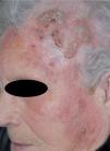 Exploración físicaEn la región frontal y temporal izquierda, extendiéndose hasta la zona malar y la mejilla izquierda, se apreciaba una gran placa eritematosa y descamativa, con áreas de color amarillento en algunas zonas. En la parte superior izquierda se apreciaban lesiones exofíticas y queratósicas. No existía afectación de mucosas ni alteración del estado general.