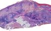 HistopatologíaEn la biopsia de uno de los bordes se observaba a pequeño aumento una epidermis ligeramente acantósica y ulcerada, sin otra alteración destacable, y ocupando todo el espesor de la dermis y el tejido celular subcutáneo un infiltrado inflamatorio granulomatoso. Los granulomas presentaban una corona linfocitaria (fig. 2).