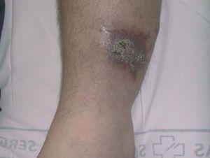 A la exploración se observó una placa violácea de 8 x6 cm de diámetro, de bordes netos, localizada en el tercio distal de la región pretibial izquierda (fig. 1). No se evidenció aumento local de la temperatura ni varicosidades.
