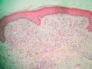 El estudio histopatológico evidenció un aumento en el número de capilares neoformados en la dermis superficial y media. Alrededor de esta proliferación vascular se veía un ligero infiltrado inflamatorio crónico y depósitos de hemosiderina en la dermis profunda. La epidermis suprayacente era normal (fig. 2).