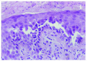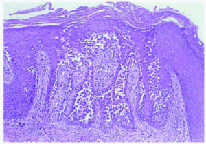 Histopatológicamente, en la epidermis se observaban hendiduras suprabasales que contenían queratinocitos acantolíticos. Algunas de las células mostraban disqueratosis, pero no se apreciaban cuerpos redondos. La superficie de la epidermis se mostraba hiperqueratósica, con orto y paraqueratosis. En la dermis existía un moderado infiltrado inflamatorio perivascular compuesto por linfocitos e histiocitos.