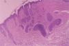 Histológicamente, los tricoepiteliomas se clasifican según el grado de diferenciación del germen folicular, aunque genéricamente presentan islotes de células basaloides que, en algunas áreas, muestran una empalizada periférica, rodeadas de un estroma fibrocítico, que suelen mostrar diferenciación folicular hacia bulbo y papilas foliculares, respectivamente8 . El componente estromal es de gran importancia para establecer el diagnóstico diferencial con el carcinoma basocelular, ya que el tricoepitelioma presenta un estroma con abundante celularidad y cuerpos mesenquimatosos papilares, pero no inducción mucinosa, desmoplasia ni telangiectasias arboriformes. Es bastante frecuente la presencia de pequeños quistes de queratina recubiertos por epitelio escamoso estratificado que, si se rompen, provocan un pequeño granuloma a cuerpo extraño en el estroma. Las agregaciones de fibroblastos son características del tricoepitelioma9 . Las tinciones de inmunohistoquímica en los tricoepiteliomas muestran una fuerte afinidad para las citoqueratinas CK 5/6 y CK 8, y débil para CK 17 en las células que rodean a los quistes córneos10 . El protooncogén bcl2 , que codifica la proteína bcl2, que inhibe la apoptosis, es un marcador útil para el diagnóstico en casos de difícil diferenciación histológica11 .