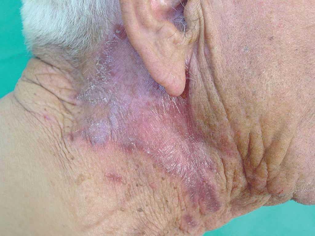 A la exploración cutánea se observaron varias placas eritematosas parduzcas de bordes irregulares, con descamación superficial y centro atrófico localizadas en el cuello (fig. 1) y la espalda (fig. 2). El lóbulo auricular izquierdo estaba infiltrado y ulcerado (fig. 3). No se palpaban adenopatías.