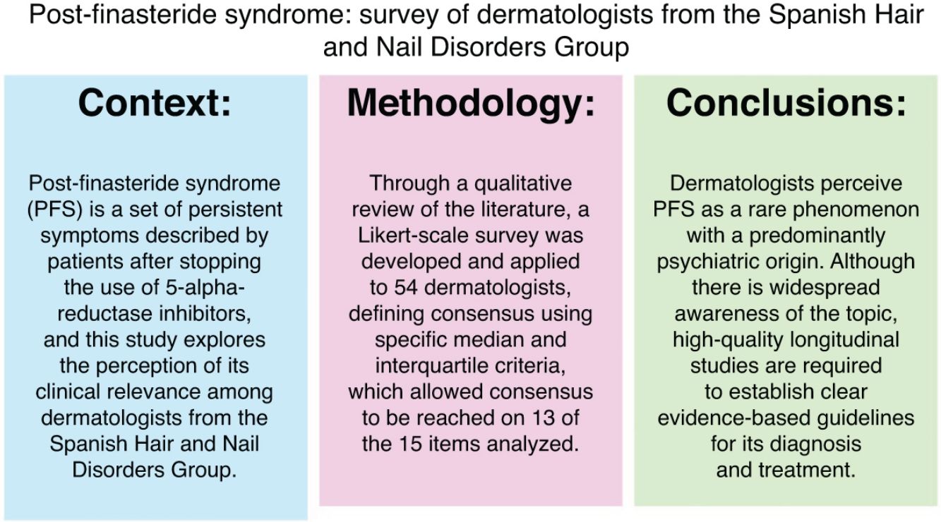 Post-finasteride syndrome (PFS) refers to a group of signs and symptoms reported by patients who have used finasteride and whose symptoms do not resolve after discontinuation of the drug. In essence, the disorder is defined by the presence of sexual dysfunction, physical symptoms, and psychological disturbances that persist after cessation of the medication, regardless of dose, duration of treatment, age, or medical indication.1–5 Although finasteride has been an approved and widely used treatment for androgenetic alopecia (AGA) since 1997,6 PFS was not reported until 2011,1 which has generated debate within the medical community and among patient groups.5,7,8 Given that the existence of PFS and its etiology remain controversial, this study aimed to explore the opinions of dermatologists belonging to the Spanish Hair and Nail Disorders Group (GETO) of the Spanish Academy of Dermatology and Venereology in order to obtain a clearer understanding of the clinical perception of this syndrome.