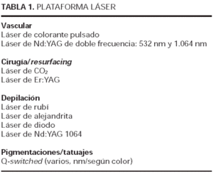 Si realmente en una clínica dermatológica se quieren realizar todas las posibilidades que actualmente ofrecen los láseres, será necesario tener una plataforma láser que ha de contar con los tipos de láser que se muestran en la tabla 1 según indicaciones.