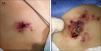 Distinct clinical forms of mucormycosis are described. The most common is rhinocerebral mucormycosis, followed by pulmonary, gastrointestinal, cutaneous, and disseminated forms. The cutaneous form (10%–19% of cases) is the result of direct inoculation of the spores into the dermis or direct contact of the skin with contaminated material.4 It can also be caused by traumatic injuries (70%), surgical interventions (15%), burns (3%), and, in the case of nosocomial infections, contact with contaminated material such as sheets,5 intravenous lines, adhesives,6 or wooden tongue depressors.7