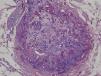 An 8-year-old girl with a personal history of severe epileptiform encephalopathy was admitted to the pediatric intensive care unit for epileptic status with decreased consciousness, for which treatment with anticonvulsants and systemic corticosteroids was instituted. Two weeks after admission she underwent assessment at the dermatology department for lesions on the abdomen that had appeared a few hours earlier. Erythematous and purpuric papules and pseudovesicles were clustered irregularly on an erythematous base with a necrotic center (Fig. 1A). An underlying firm, infiltrated plaque covered an area greater than that of the visible lesions. Ultrasound showed a poorly defined mass of increased echogenicity in the subcutaneous tissue that was compatible with inflammatory alterations. Given the acute course and the presence of an underlying mass, a deep biopsy was performed, revealing the presence of foul-smelling fatty tissue with a putrefied appearance (Fig. 1B), suggestive of a necrotic infection. A sample was taken for microbiological analysis and calcofluor-white staining and fungal culture were ordered. Direct observation revealed the presence of numerous broad, branched, aseptate hyphae compatible with mucormycosis (Fig. 2). After extensive early surgical resection liposomal amphotericin B treatment was instituted and corticosteroid treatment gradually withdrawn. Histology revealed intense dermal necrosis and blood vessel obstruction by numerous fungal structures (Fig. 3). Diagnosis was confirmed based on the results of the fungal culture, from which Rhizopus arrhizus was isolated following ethanol-formic acid extraction and MALDI-TOF (matrix-assisted laser desorption/ionization – time-of-flight) mass spectrometry.1 After lesion spread was ruled out the patient was diagnosed with primary cutaneous mucormycosis due to R. arrhizus. The early initiation of treatment resulted in a favorable response and progressive improvement of the patient's clinical picture. No new lesions appeared nor were other organs affected.