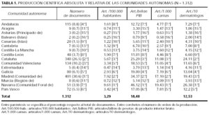 Se estudiaron los 1.312 documentos citables recuperados. Las comunidades autónomas más productivas son la de Madrid, con 401 documentos (30,6 %) y Cataluña, con 348 documentos (26,5 %), lo que representa más del 50 % de la producción nacional. La comunidad de La Rioja no tiene ninguna publicación recogida por la base de datos estudiada.