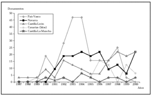 Las comunidades de Madrid y Cataluña, aunque han aumentado su número de publicaciones, han disminuido porcentualmente respecto al total, dejando más protagonismo a las comunidades autónomas más pequeñas y con menos tradición de publicaciones. Sólo cinco comunidades han publicado documentos a lo largo de todo el período de estudio: Andalucía, Cataluña, Castilla-León, Comunidad Valenciana y Madrid; de ellas es la Comunidad de Castilla-León la que ha mostrado un crecimiento más significativo.