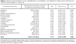 De los 1.312 documentos recuperados, 1.263 (96,2 %) estaban publicados en revistas incluidas en el JCR, es decir, en revistas con factor de impacto. Sólo sobre esos documentos se ha estudiado el FIM. Entre el 85,7 y el 100 % de los documentos de las comunidades autónomas tienen FIM. La tabla 3 resume el FIM y el FIR de todas ellas. La comunidad con mayor FIM para sus documentos es Asturias con 2,570. Le siguen otras dos comunidades uniprovinciales: Murcia (1,440) y Cantabria (1,311). A continuación están Navarra (1,259), Cataluña (1,213), Canarias (1,160), Madrid (1,151), Castilla-La Mancha (1,154) y Aragón (1,133). De las 16 comunidades autónomas con documentos analizables, nueve tienen FIR superior a la unidad.