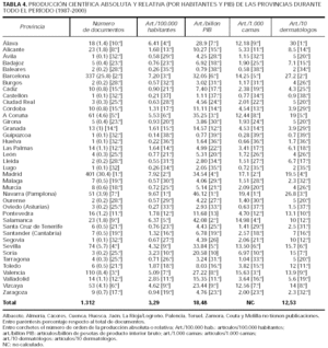 Cuando la producción científica se pondera por habitantes destacan en los primeros lugares ocho provincias con una producción por encima de la media: Navarra, Madrid, Barcelona, Álava, Salamanca, A Coruña, Valencia, Vizcaya y Sevilla. Al ponderar la producción por parámetros económicos las primeras nueve provincias (producción ponderada superior a la media nacional) son Navarra, Salamanca, A Coruña, Madrid, Sevilla, Barcelona, Álava, Valencia y Vizcaya.