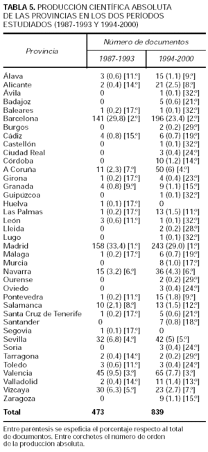 Comparación de la producción científica absoluta y relativa por provincias en los dos períodos (1987-1993 y 1994-2000) (tabla 5)