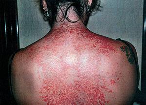 Una mujer de 32 años consultó por una erupción localizada en el tronco, de unos 6 meses de evolución, muy pruriginosa y sin respuesta a previos tratamientos con mometasona tópica, deflazacort y prednisona oral. La paciente no presentaba ningún antecedente personal patológico y no recibía medicación alguna salvo anticonceptivos orales. La exploración reveló una extensa dermatosis constituida por pequeñas pápulas eritematosas con una peculiar distribución por el centro de la espalda hasta la zona lumbar (fig. 1). Algunos elementos llegaban a ser vesiculosos. En unos días, las lesiones se hicieron erosivas y costrosas (fig. 2). La paciente describía episodios recurrentes de nuevas lesiones. Refería además que, al trabajar en servicios de limpieza, sudaba mucho y esto parecía corresponderse con un rebrote de la enfermedad.