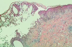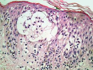 Un estudio analítico sistemático que incluía anticuerpos antinucleares (ANA) y anticuerpos contra la transglutaminasa tisular resultó normal o negativo. Se realizaron dos biopsias. En una de ellas se podía apreciar una ampolla intraepidérmica por espongiosis masiva (fig. 3) y la presencia, en su techo, de microabscesos de neutrófilos. En la otra, el hallazgo más destacable era la presencia de vesículas espongióticas por intensa exocitosis epidérmica de neutrófilos (fig. 4), con focos de daño vacuolar y necrosis de queratinocitos aislados.