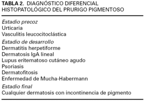 Resulta importante entender que los hallazgos histopatológicos reflejan el mismo dinamismo que, en sólo días, es posible observar en las lesiones clínicas. En un estadio precoz (pápulas urticadas) se observa un infiltrado perivascular superficial de neutrófilos, polvo nuclear, edema de la dermis papilar y una incipiente espongiosis neutrofílica hacia la epidermis. En el estadio de desarrollo (papulovesículas y costras) aparecen francas vesículas espongióticas, microabscesos de neutrófilos, necrosis de queratinocitos, un infiltrado linfocitario de disposición liquenoide, células disqueratósicas, cierto número de eosinófilos en dermis y epidermis y la posibilidad de ampollas tanto intraepidérmicas (por espongiosis) como subepidérmicas (por daño vacuolar basal). En el estadio final (mácula pigmentada) se aprecia hiperpigmentación epidérmica, infiltrados linfoides perivasculares e incontinencia de pigmento (melanófagos en dermis). La inmunofluorescencia directa es negativa. El diagnóstico diferencial histopatológico se recoge en la tabla 2.