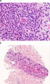 Le fueron biopsiada tanto una lesión pustulosa digital como una placa tumefacta del codo. En ambos casos se observaba una colección masiva de polimorfonucleares constituyendo un absceso, junto a imágenes basófilas, en forma de agregados finamente granulares, compatibles con émbolos sépticos (fig. 2a). En la primera zona se objetivó un agregado trombótico en el interior de los vasos con escasa respuesta inflamatoria de pared (vasculopatía trombótica) (fig. 2b).