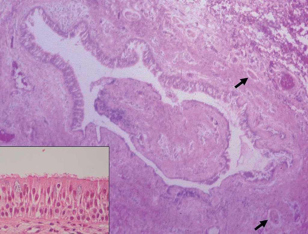 Fig. 2.—Formación quística, intradérmica, unilocular, tapizada por epitelio cilíndrico pseudoestratificado tipo respiratorio (recuadro) y fragmentos irregulares de músculo liso en su pared (flechas). (Hematoxilina-eosina, ×40.)