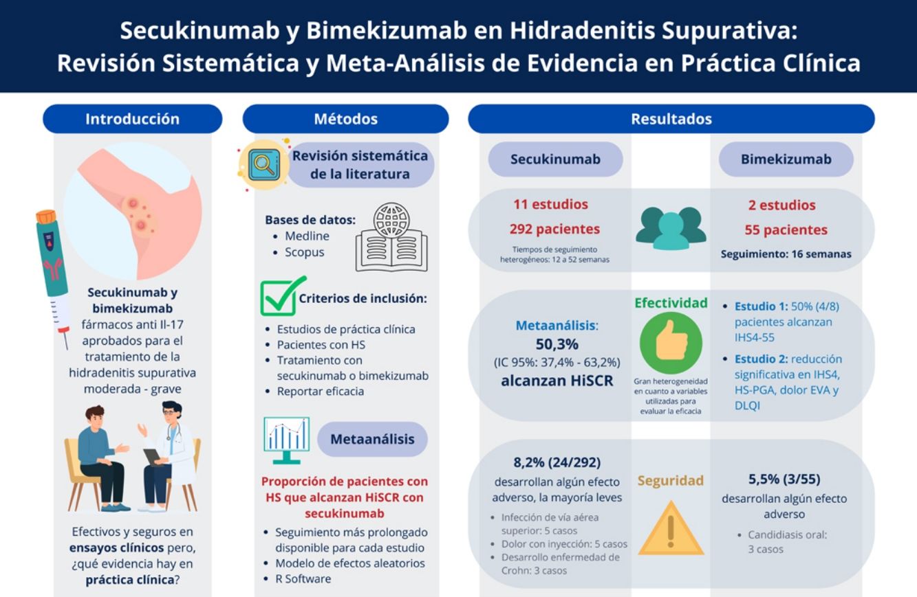 DiscussionThis systematic review compiles the available evidence on the use of the 2 IL-17 inhibitors approved for the treatment of HS, secukinumab and bimekizumab, in real-world clinical practice. A total of 13 studies were included, involving 292 HS patients on secukinumab and 55 patients on bimekizumab. Of those on secukinumab, the meta-analysis found that 50.31% achieved HiSCR at the longest follow-up available. Patients on bimekizumab showed significant reductions in IHS4 and pain VAS scores, among other measures.
