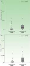 There was no statistically significant difference between esthetic results and the following variables: sex, phototype, hypertension, diabetes mellitus or any category of smoking habit. Although the group with “better esthetic results” had a slightly younger age, this difference was also deemed not statistically significant.