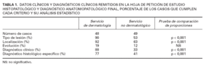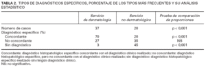 La prueba de comparación de proporciones aplicada para comprobar si existían diferencias estadísticamente significativas entre el diagnóstico histológico específico del servicio de dermatología y los servicios no dermatológicos (tabla 1) demostró que las diferencias tenían significación estadística (p < 0,001). El análisis estadístico efectuado para comparar los diagnósticos específicos concordantes entre los dos grupos (tabla 2) también demuestra que las diferencias eran estadísticamente significativas (p < 0,001).