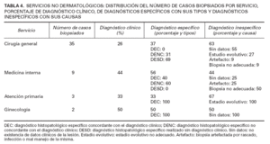 TABLA 4. SERVICIOS NO DERMATOLÓGICOS: DISTRIBUCIÓN DEL NÚMERO DE CASOS BIOPSIADOS POR SERVICIO, PORCENTAJE DE DIAGNÓSTICO CLÍNICO, DE DIAGNÓSTICOS ESPECÍFICOS CON SUS TIPOS Y DIAGNÓSTICOS INESPECÍFICOS CON SUS CAUSAS