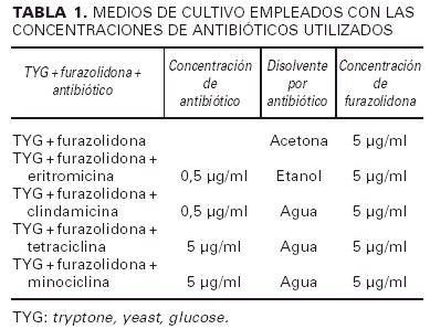 La toma de muestra se realizó en la consulta con un escobillón estéril, previamente sumergido en un líquido preparado («solución de lavado»), consistente en la mezcla de 0,075 M de sodio fosfato monobásico dihidrato y sodio fosfato dibásico, obteniendo una solución de pH 7,9 y a la que añadimos 0,1% Triton X-100 como conservante5. Dicha mezcla da una solución tampón que respeta el equilibrio hídrico de la bacteria sin el cual no sería posible su cultivo adecuado. La torunda del escobillón se pasó con firmeza, de forma que se arqueara el hisopo del escobillón, y con movimientos desde arriba hacia abajo por las mejillas, la frente y la nariz y de izquierda a derecha en la barbilla y el bigote. Mientras se tomaba la muestra se iba dando vueltas a la torunda de algodón, de forma que se le adhirieran las bacterias de forma homogénea. A continuación se introdujo el escobillón en un medio de transporte apto para anaerobios (medio AMIES) hasta que se realizó la siembra en un plazo inferior a 24 horas en el laboratorio. Una vez en el laboratorio se procedió a la inoculación en placas de Agar preparadas con el medio TYG, medio muy específico para el crecimiento del Propionibacterium acnes compuesto por 20 g de peptona trípsica de caseína, 10 g de extracto de levadura, 10 g de Agar y 5 g de glucosa disueltos en 1 litro de agua destilada. A estas placas se les añadieron por separado los antibióticos adecuados (eritromicina, clindamicina, tetraciclina y minociclina); en todas las placas se agregó furazolidona para inhibir el crecimiento de estafilococos (tabla 1). Después de 7 días de incubar en condiciones anaerobias a 37º C, las placas se inspeccionaron para ver el crecimiento, que se graduó en una escala de 0 a 3 + (0: ningún crecimiento; 1: crecimiento bajo [1 a 50 colonias]; 2: crecimiento intermedio [51 a 200 colonias]; 3: crecimiento alto [a partir de 200 colonias]. La equivalencia en términos de resistencia fue interpretada como: 0: no hay resistencia; 1: bajo grado de resistencia; 2: resistencia intermedia; 3: alta resistencia. La identificación del Propionibacterium acnes se basó en la presencia de colonias con el característico color crema/rosa y un olor como a «huevos podridos», apoyándose el diagnóstico en el microscopio óptico que mostró la típica presencia de bacilos curvados grampositivos17.