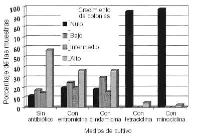 El grado de resistencia del Propionibacterium acnes obtenido en nuestro trabajo es mayor con las tetraciclinas clásicas que con la minociclina2. El hecho de que en el 95,5% de los casos no hubiera ningún tipo de crecimiento bacteriano en los cultivos con tetraciclina puede hacernos pensar que la resistencia a las tetraciclinas es bastante baja, a pesar de ser uno de los primeros antibióticos usados para el tratamiento del acné y que es considerada aún como un tratamiento de primera elección21. Sin embargo, en el Reino Unido y en Estados Unidos se están detectando cada vez más cepas de Propionibacterium acnes resistentes a diferentes tipos de tetraciclinas, además de a la eritromicina y a la clindamicina, reduciéndose de este modo el número de opciones terapéuticas2.