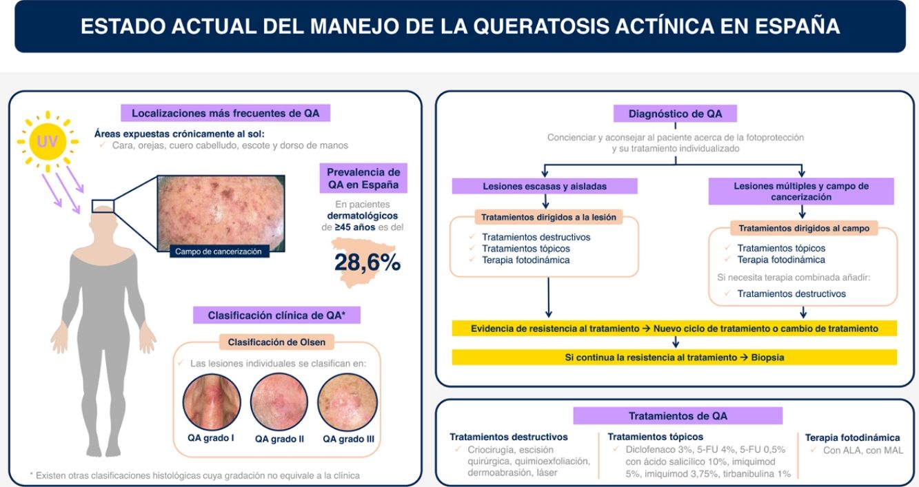 Las queratosis actínicas (QA) son lesiones cutáneas frecuentes que surgen en la piel crónicamente expuesta a los rayos ultravioleta y que potencialmente pueden progresar a un carcinoma epidermoide cutáneo (CEC) infiltrante. Debido a que no se puede predecir qué lesiones progresarán a CEC ni cuándo, generalmente se recomienda el tratamiento de todas las QA. Existe un amplio abanico de tratamientos disponibles para la QA a los que se les han unido nuevas aprobaciones en los últimos años. Estos cambios en los tratamientos disponibles para la QA hacen necesaria la revisión de la evidencia científica y del estado actual del diagnóstico y manejo de la QA en España.